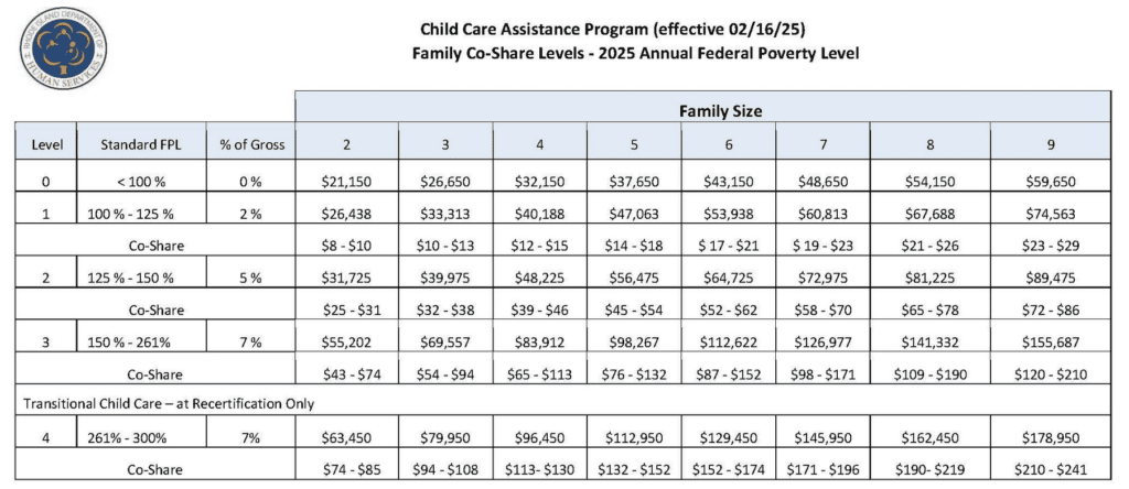 For example, a family of four with a household income below 200% of the FPL may qualify for child care assistance.
